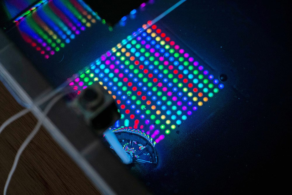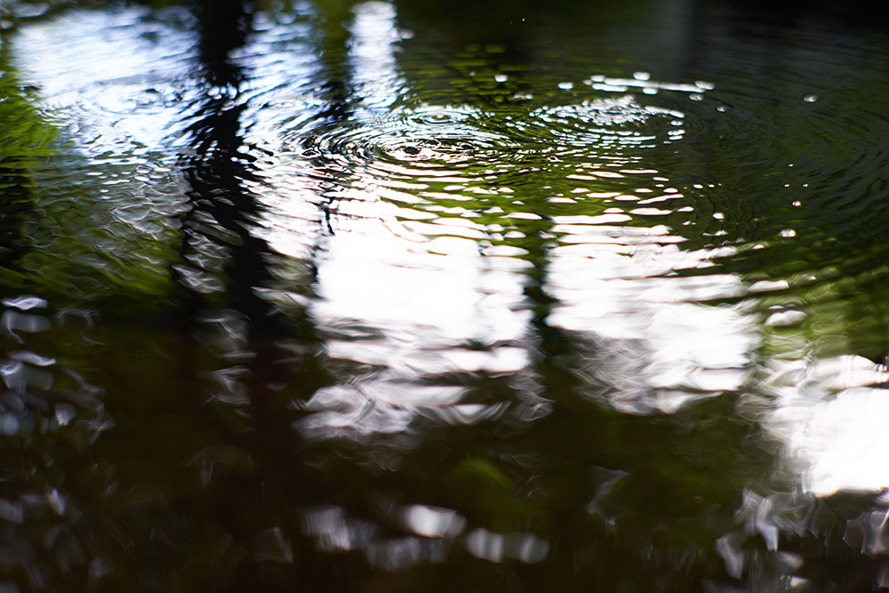 街並みが水たまりに反射し、風で揺らめく様子を眺めていて、それを再現したいと思い、制作をはじめた。モールス信号のリズムで打ち出される波で水面を揺らし、その水面に映るLEDの変化を写真として切り取る。キーボードで打ち込まれた文字が波紋となって広がり、壁に跳ね返ったり、次に打ち出される文字とぶつかったりしながらだんだん消えていく。ソレノイドの制御にprocessingとArduinoを使い、LEDの色変化はArduino、一眼レフをスクリーンに出力し、フレームレートを変更するためにp5.jsを使った。
