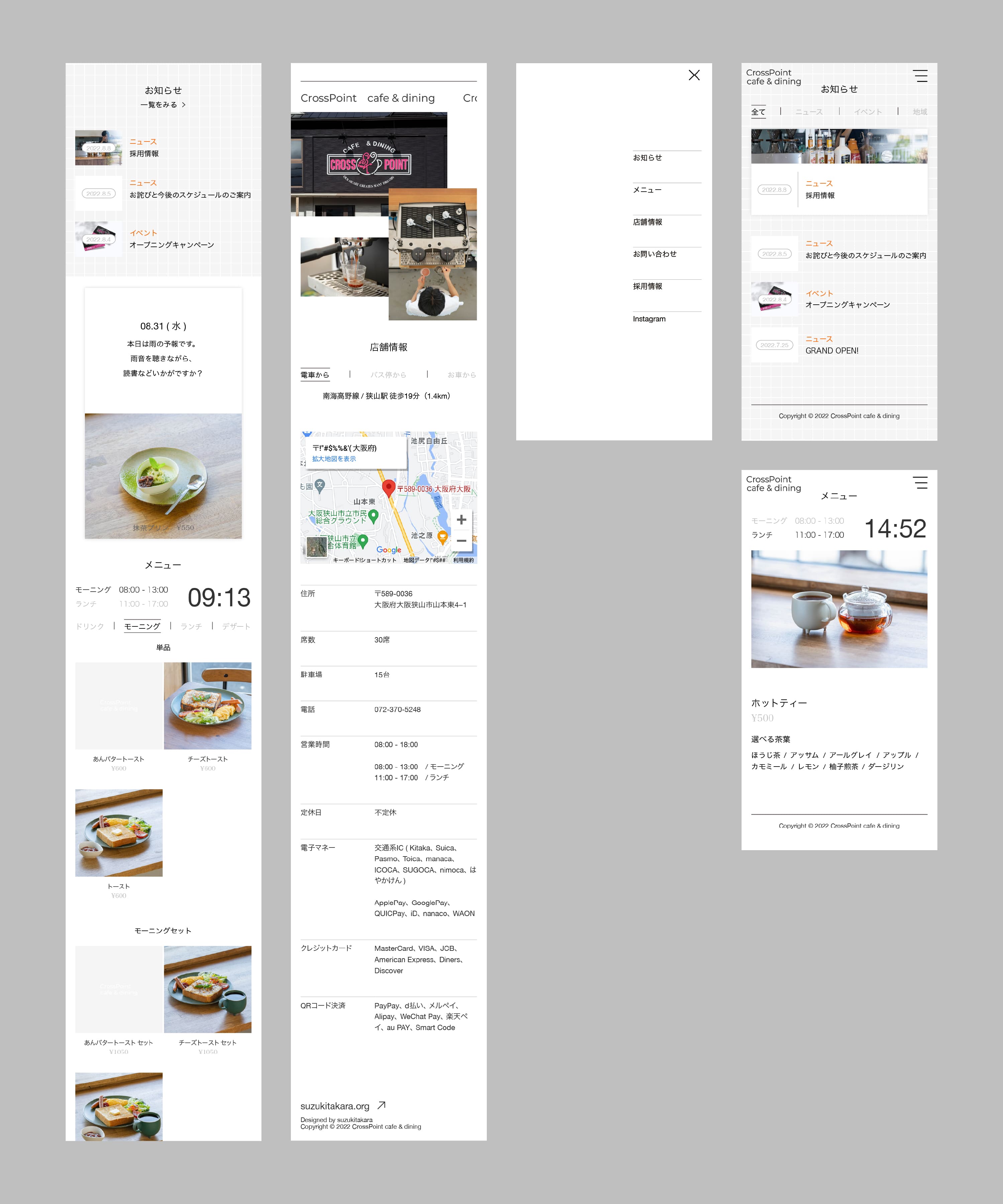 カフェのウェルカムボードを参考に、天気予報APIを使い、気象に応じた文章と写真を表示するほか、時間に合わせてメインビジュアルや、タブのファーストビューを決定する。劣化版SNSを目指すより、同じようだけど日々違うという変化がカフェに合うメディアだと思った。また、ウェブサイトの運用を自分たちで行ってほしいので、スプレッドシートで更新できるようにすることで、サイト運営だけでなく、コンテンツのアーカイブを表で管理することができる。